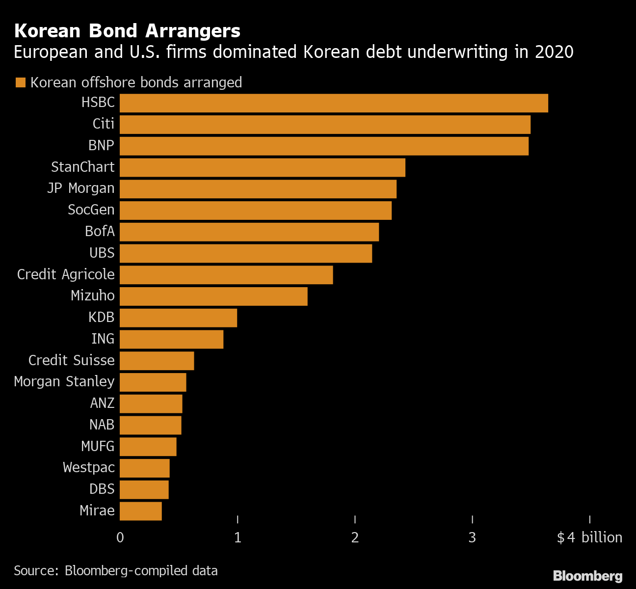 European and U.S. firms dominated Korean debt underwriting in 2020