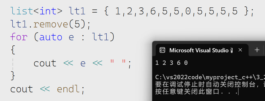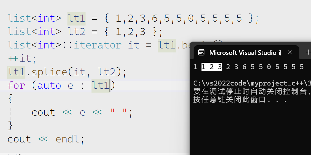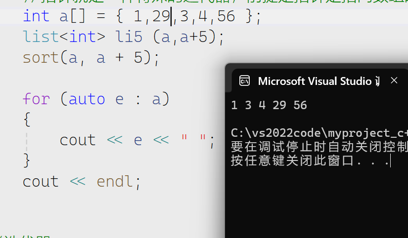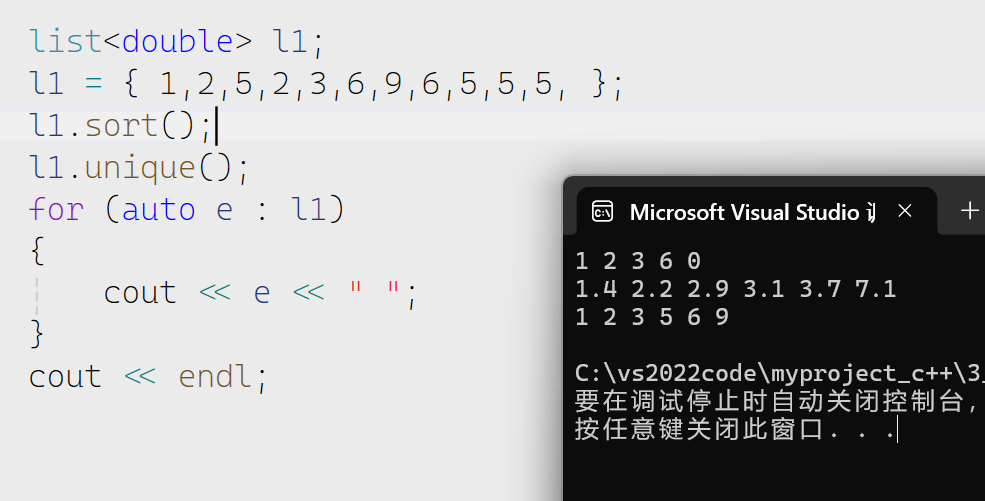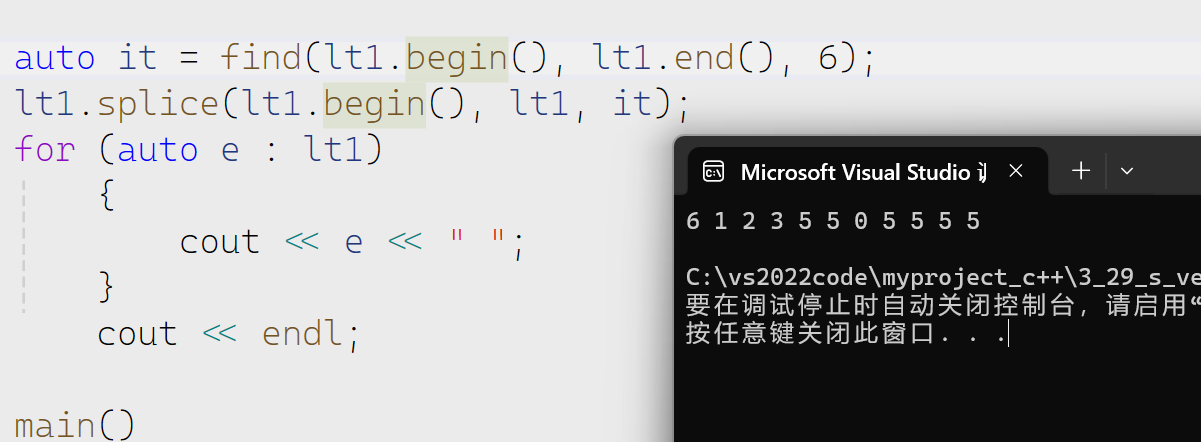 #define _CRT_SECURE_NO_WARNINGS #include<iostream> #include<list> #include<vector> #include<algorithm> using namespace std; //construct void test01() { list<int> lt1; list<int> li2(10,1);//创10个,初始化为1 vector<int> v1 = { 1,2,3,6,5,5,0 }; list<int> li3(v1.begin(),v1.end());//迭代器来进行初始化 list<int> li4 = { 9,8,7,6,5,2,3};//用花括号来进行初始化 //对于之前的容器,list也可以用下面这种方式来进行初始化 //迭代器除了可以传迭代器区间,也可以传数组的指针。 //指针就是一种特殊的迭代器,前提是指针是指向数组的指针。 int a[] = { 1,29,3,4,56 }; list<int> li5 (a,a+5); sort(a, a + 5); for (auto e : a) { cout << e << " "; } cout << endl; } //迭代器 void test02() { //1.通用的相似的遍历容器的方式,并封装屏蔽 //容器结构的差异和实现底层细节 //2.复用,实现算法时用迭代器函数模板实现,跟底层结构 list<int> lt1 = { 1,2,3,6,5,5,0 }; list<int>::iterator it = lt1.begin(); while (it != lt1.end()) { cout << (*it)<<" "; it++; } cout << endl; vector<int> v1 = { 1,2,3,6,5,5,0 }; sort(v1.begin(), v1.end()); for (auto e : v1) { cout << e << " "; } cout << endl; /*sort(lt1.begin(), lt1.end()); for (auto e : lt1) { cout << e << " "; } cout << endl;*/ } void test03() { list<int> lt1 = { 1,2,3,6,5,5,0 }; for (auto e : lt1) { cout << e << " "; } cout << endl; lt1.push_back(99); lt1.push_front(88); for (auto e : lt1) { cout << e << " "; } cout << endl; lt1.pop_back(); lt1.pop_front(); for (auto e : lt1) { cout << e << " "; } cout << endl; lt1.insert(lt1.begin(), 100); for (auto e : lt1) { cout << e << " "; } cout << endl; lt1.erase(lt1.begin()); for (auto e : lt1) { cout << e << " "; } cout << endl; lt1.resize(5); for (auto e : lt1) { cout << e << " "; } cout << endl; lt1.resize(50, 1); for (auto e : lt1) { cout << e << " "; } cout << endl; } void test04() { list<int> lt1 = { 1,2,3,6,5,5,0,5,5,5,5 }; lt1.remove(5); for (auto e : lt1) { cout << e << " "; } cout << endl; //merge list<double> first, second; first.push_back(3.1); first.push_back(2.2); first.push_back(2.9); second.push_back(3.7); second.push_back(7.1); second.push_back(1.4); //要求是两个有序的链表 first.sort(); second.sort(); first.merge(second); //second会变成空的 for (auto e : first) { cout << e << " "; } cout << endl; list<double> l1; l1 = { 1,2,5,2,3,6,9,6,5,5,5, }; l1.sort(); l1.unique(); for (auto e : l1) { cout << e << " "; } cout << endl; } void test05() { //const int N = 10000000; // 数据量大小 //srand(time(0)); // 初始化随机数种子 //list<int> lt1; //vector<int> v; //// 填充数据 //for (int i = 0; i < N; ++i) { // auto e = rand() + i; // lt1.push_back(e); // v.push_back(e); //} //// vector排序 //int begin1 = clock(); //sort(v.begin(), v.end()); // vector用快速排序 //int end1 = clock(); //// list排序 //int begin2 = clock(); //lt1.sort(); // list用归并排序 //int end2 = clock(); //// 输出耗时 //printf("vector sort time: %d ms\n", end1 - begin1); //printf("list sort time: %d ms\n", end2 - begin2); const int N = 1000000; // 数据量大小 srand(time(0)); // 初始化随机数种子 list<int> lt1; list<int> lt2; // 填充两个list相同的数据 for (int i = 0; i < N; ++i) { auto e = rand() + i; lt1.push_back(e); lt2.push_back(e); } // 1. list直接排序(使用list::sort,归并算法) int begin1 = clock(); lt1.sort(); // list自身的归并排序 int end1 = clock(); // 2. list -> vector -> sort -> list(利用vector的快速排序) int begin2 = clock(); // 先拷贝list到vector vector<int> temp(lt2.begin(), lt2.end()); // 用vector的sort排序 sort(temp.begin(), temp.end()); // 再拷贝回list lt2.clear(); lt2.insert(lt2.begin(), temp.begin(), temp.end()); int end2 = clock(); // 输出耗时 printf("list直接排序(归并): %d ms\n", end1 - begin1); printf("list->vector->list排序(快速排序): %d ms\n", end2 - begin2); } void test06() { list<int> lt1 = { 1,2,3,6,5,5,0,5,5,5,5 }; //list<int> lt2 = { 1,2,3 }; //list<int>::iterator it = lt1.begin(); //++it; //lt1.splice(it, lt2); //for (auto e : lt1) //{ // cout << e << " "; //} //cout << endl; auto it = find(lt1.begin(), lt1.end(), 6); lt1.splice(lt1.begin(), lt1, it); for (auto e : lt1) { cout << e << " "; } cout << endl; } int main() { test06(); return 0; }