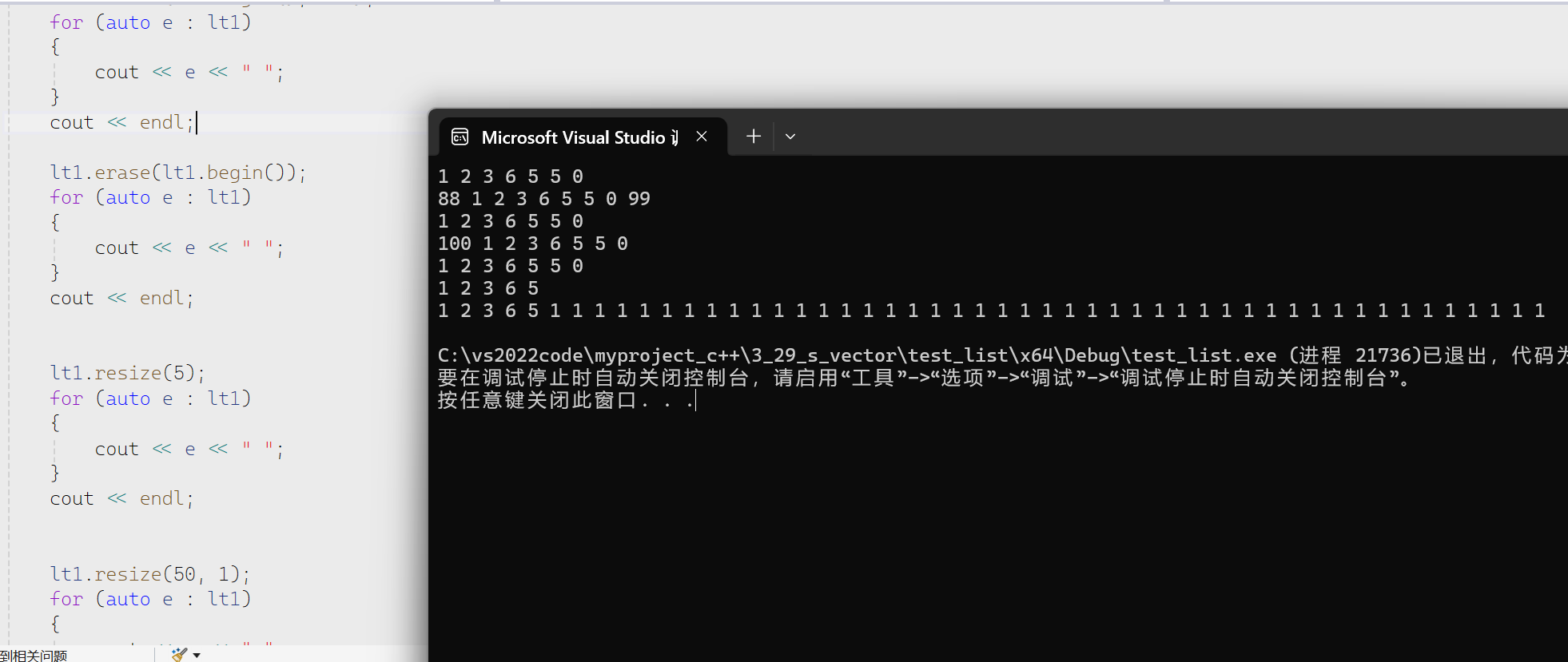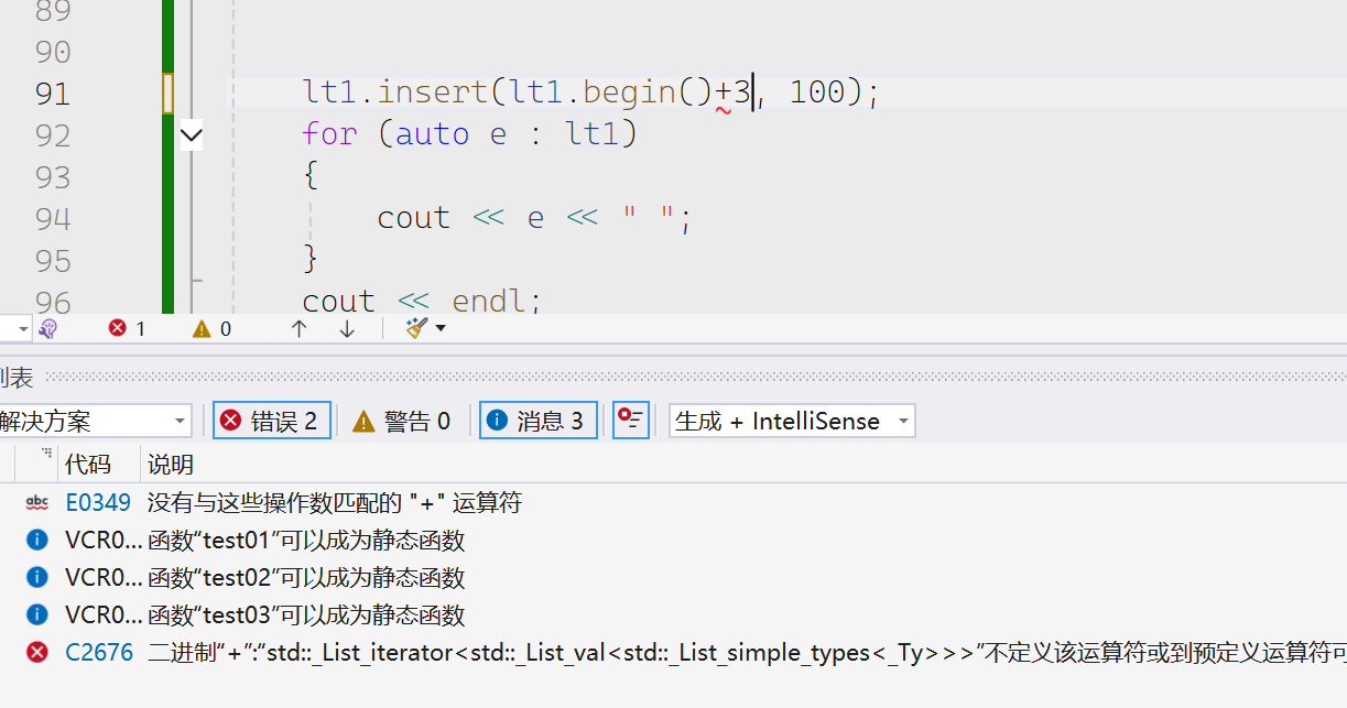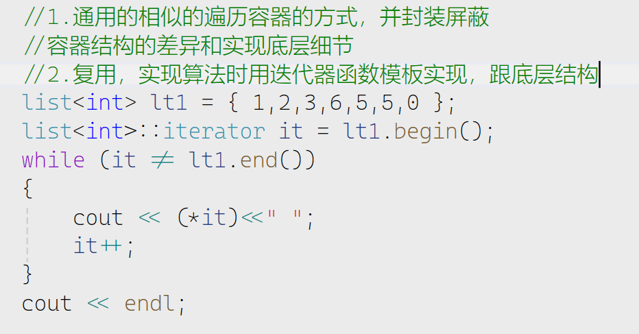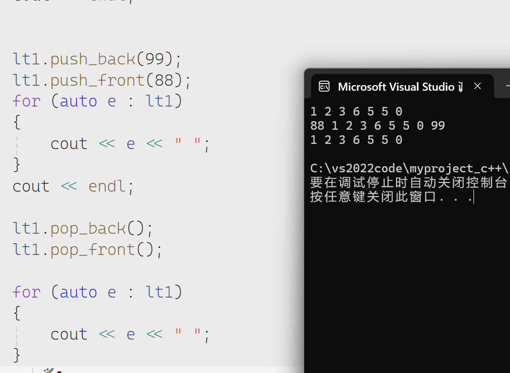 void test03() { list<int> lt1 = { 1,2,3,6,5,5,0 }; for (auto e : lt1) { cout << e << " "; } cout << endl; lt1.push_back(99); lt1.push_front(88); for (auto e : lt1) { cout << e << " "; } cout << endl; lt1.pop_back(); lt1.pop_front(); for (auto e : lt1) { cout << e << " "; } cout << endl; }list是双向迭代器是不支持