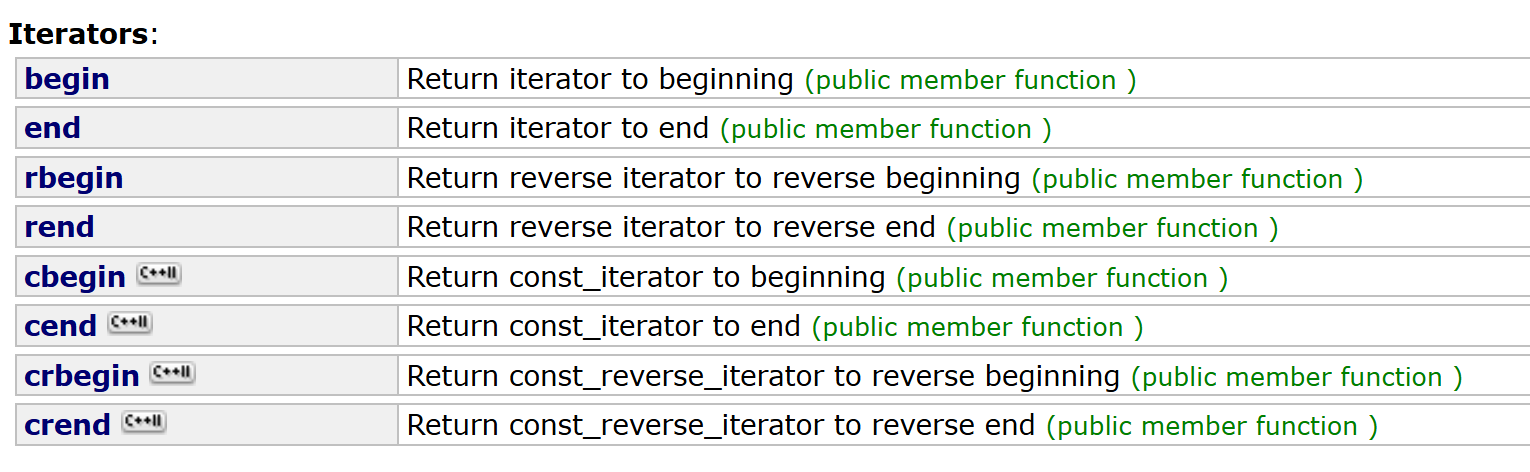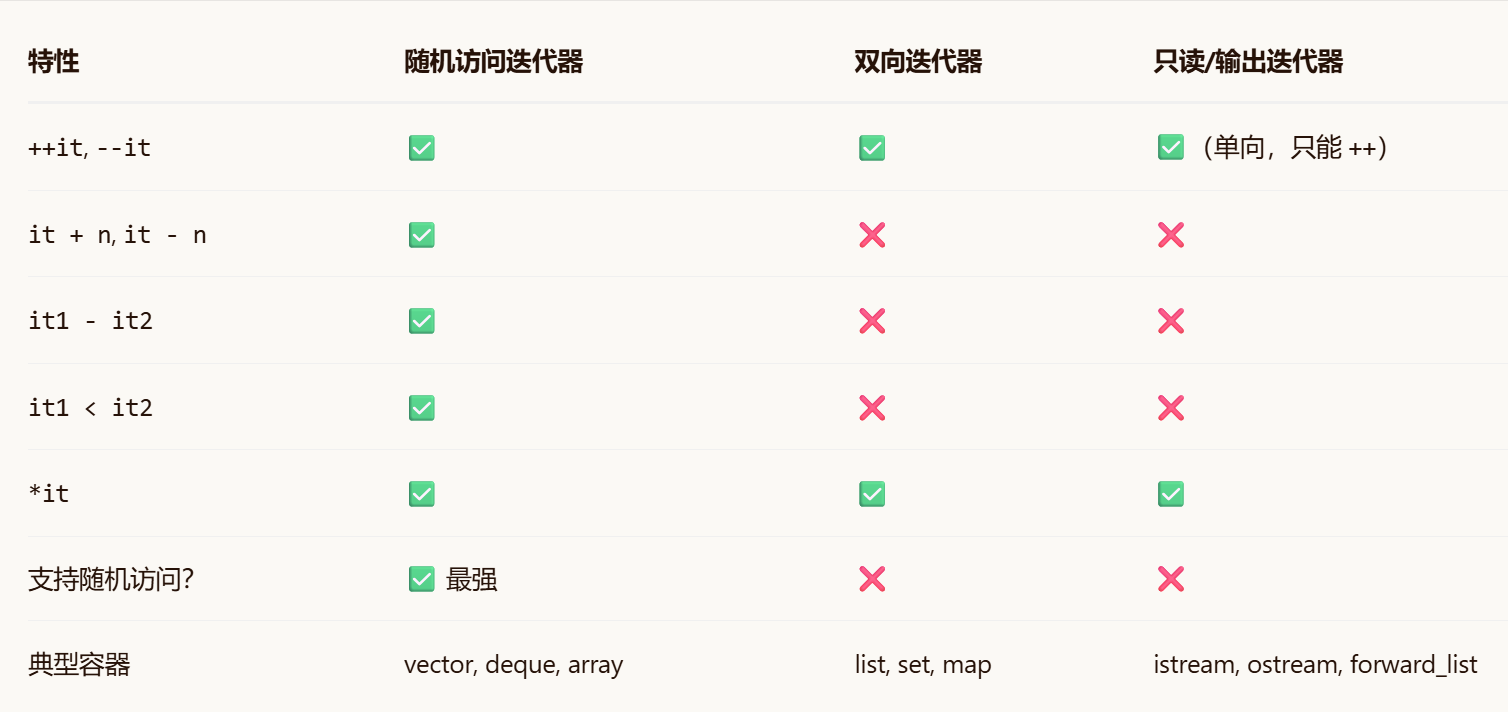 可以看到不同种类的迭代器包括随机迭代器,单向迭代器和双向迭代器,命名不同他的作用也不同