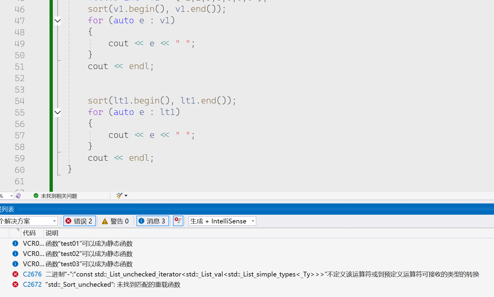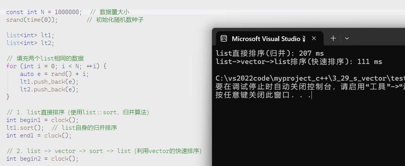由于算法库里面的vector是要求随机迭代器,所以list自己实现了一个成员函数的sort,但是两者实现的底层逻辑是不同算法库用的是快排,list自己实现用的则是归并算法。两者在数据很大的时候时间效率,list的远小于算法库的实现。