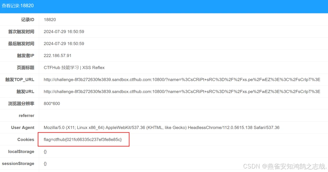再到 TLXSS 平台的项目页面查看 cookie 参数是否传到本地服务器中