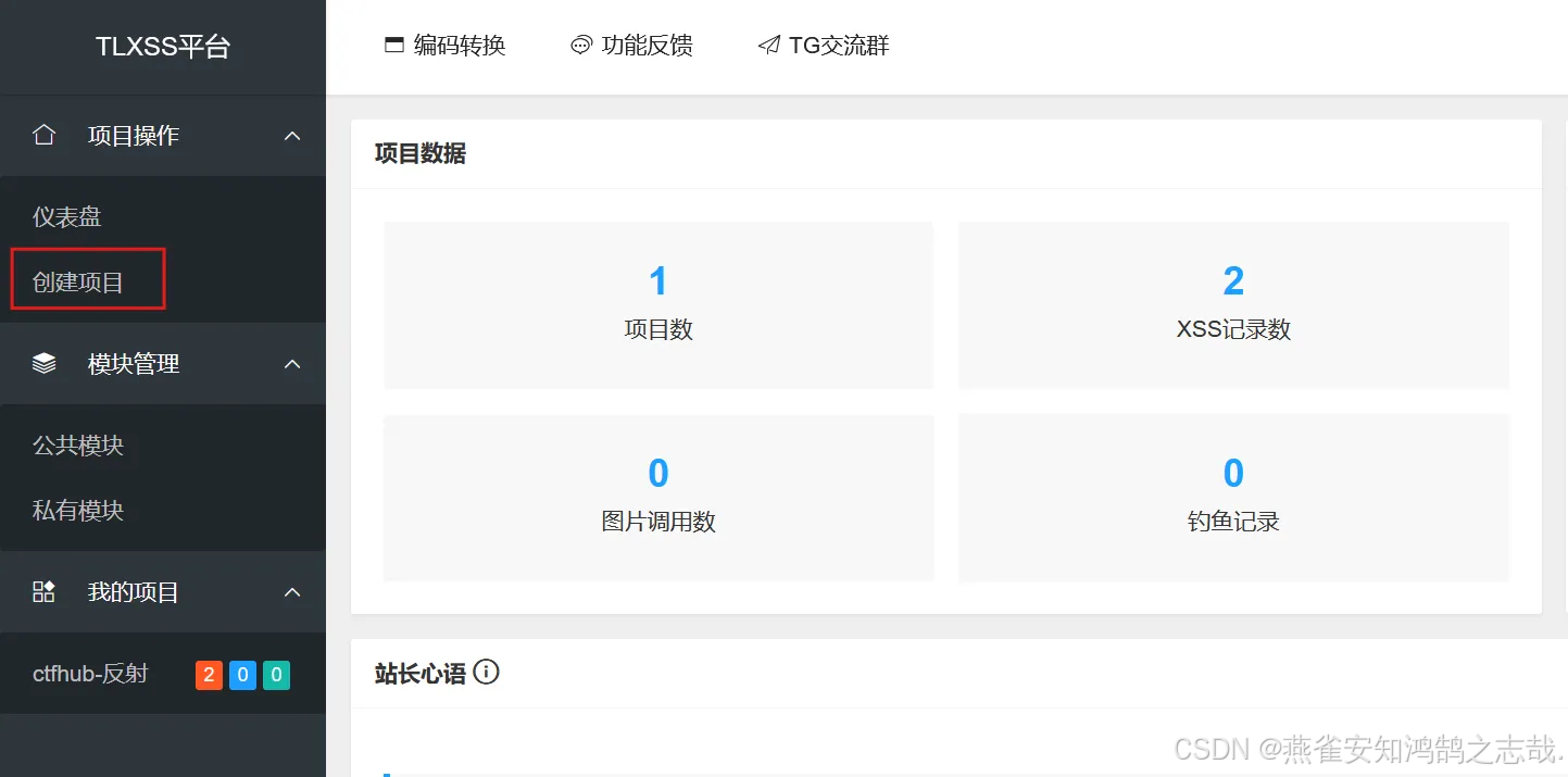 这说明 XSS 攻击通常需要使用一个服务器去接收参数,这里我们使用 TLXSS 平台(XSS平台-XSS测试网站-仅用于安全免费测试),没有账号可以注册一个,用户名最好是英文