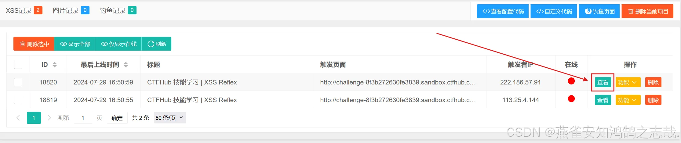 第二个输入框是模拟目标网站用户点击受污染的 URL 链接,如果点击了这个链接,那么刚刚注入的 XSS 代码将会被执行并传递到本地服务器中
