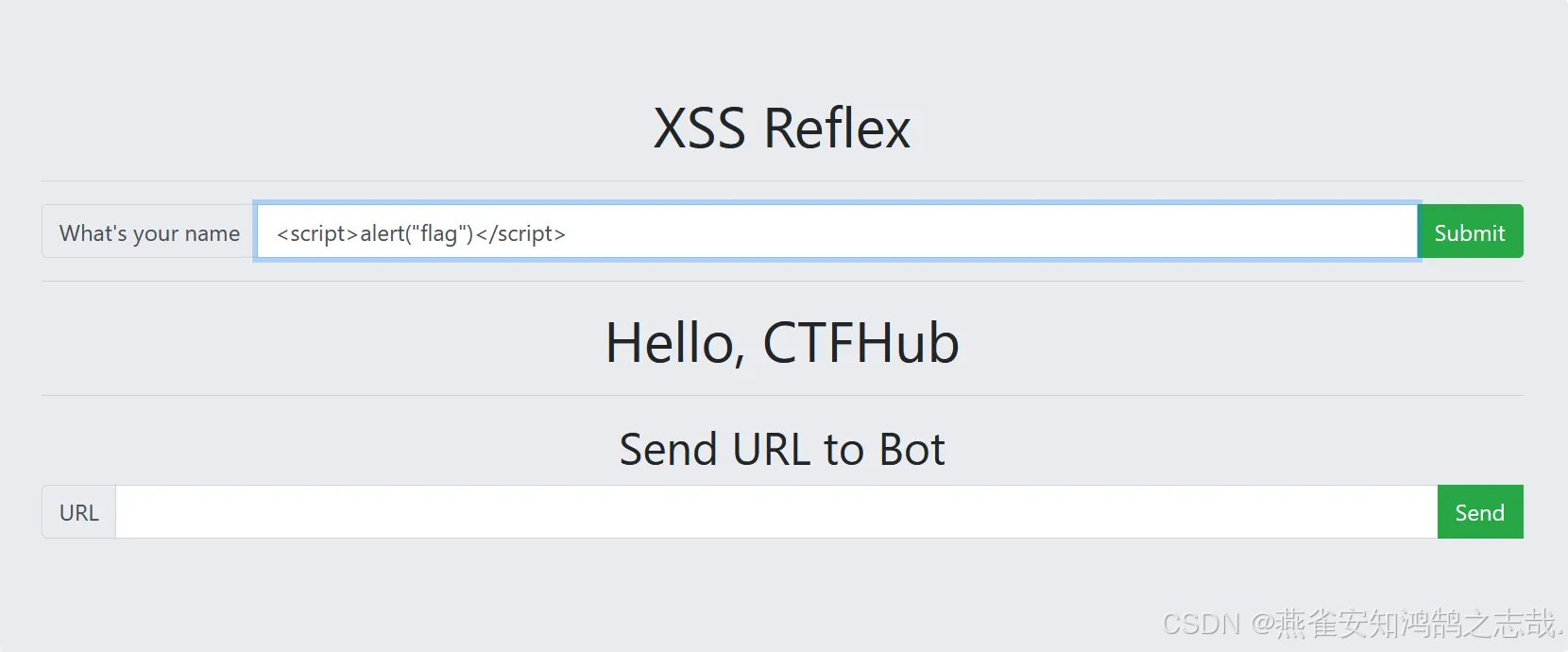 先输入以下语句测试一下,发现页面弹出窗口显示“flag”,说明这里存在 XSS 漏洞