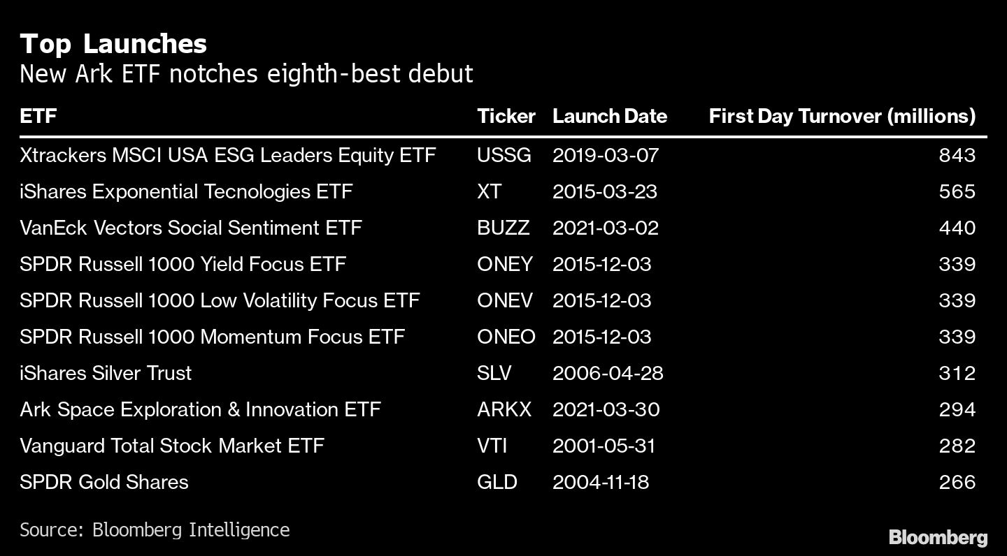 The initial spike of trading in ARKX drew comparisons to the launch of the VanEck Vectors Social Sentiment ETF ( BUZZ) earlier this month. That fund saw about $260 million worth of shares change hands in the first hour of trading, compared with $114 million for ARKX, according to Eric Balchunas, ETF analyst for Bloomberg Intelligence. In total, BUZZ traded about $440 million worth of shares in its first day.