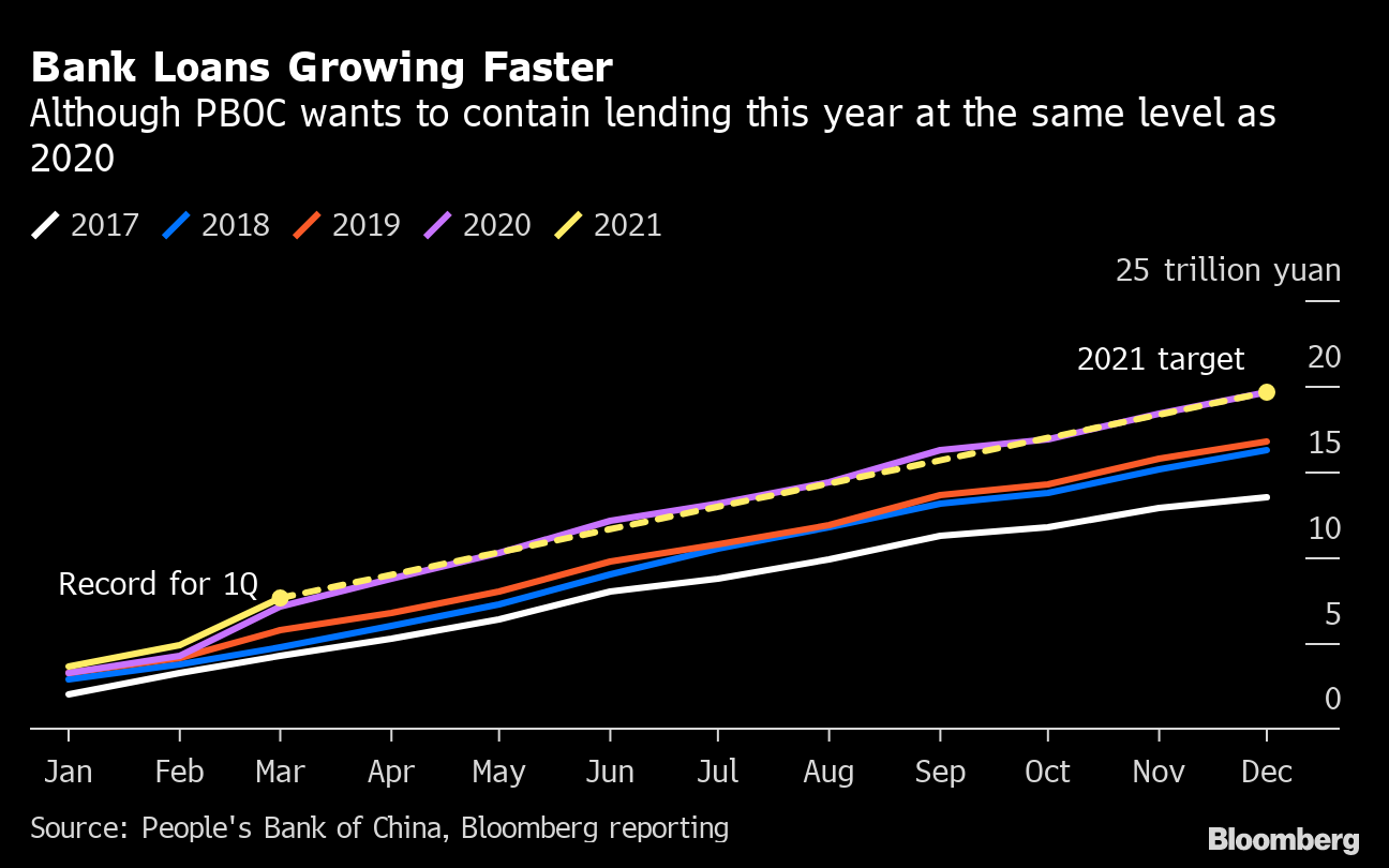 Chinese banks advanced 7.67 trillion yuan of new loans in the first quarter. That was 8% more than for the same period last year, when authorities flooded the market with cheap liquidity to help companies through the initial pandemic lockdown.