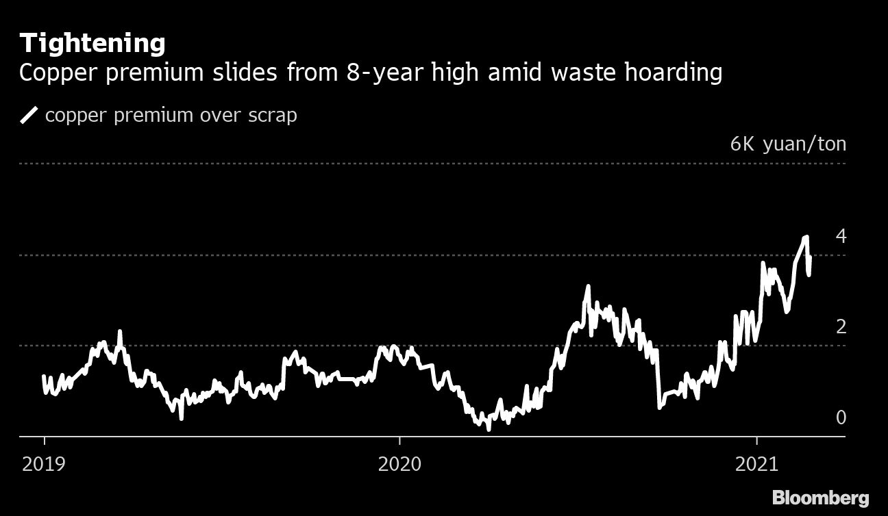 Refined-copper’s premium over scrap slid to 3,934 yuan ($610) a metric ton on Thursday, a 10% drop from Monday, when it hit the highest in eight years, according to data from Mysteel Global. The spread has narrowed as prices of the waste metal climbed after some traders hoarded supplies in anticipation of even more gains, said Li Dan, an analyst with the Shanghai-based researcher.
