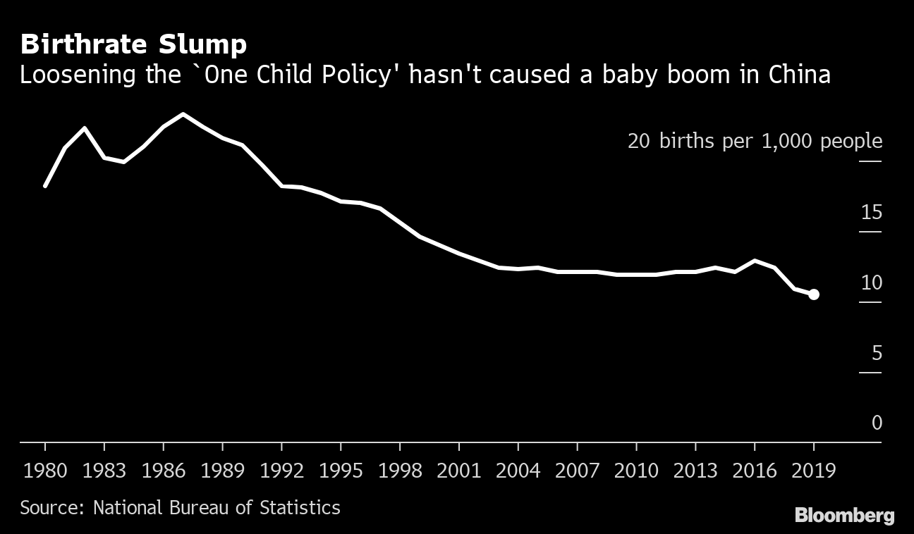 China’s birth rate has been declining steadily as the nation grows more prosperous and women’s education levels rose. The introduction of the “one child policy” went further in curbing births to limit the size of the population, but even after Beijing relaxed the policy in 2015, there was little impact in reversing the trend. The birthrate slumped to a record low of 10.48 per 1,000 people in 2019.