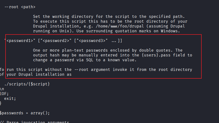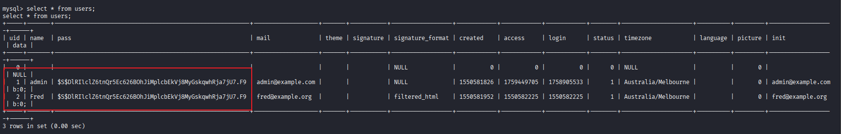 use drupaldb;update users set pass = "$S$DwSsuJZg9sNMnzfvkOg4EKvt7lMBdQ95kMfBrim.0EXmCA71skhh where name = 'admin' or name = 'Fred';