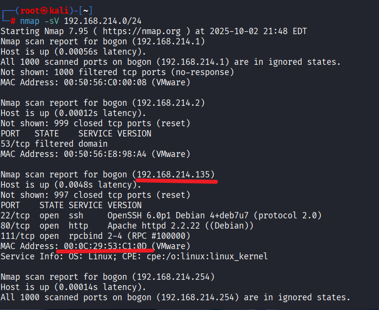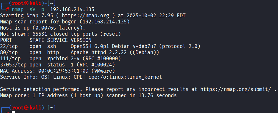:全面扫描(包含版本检测+OS检测+脚本扫描)-p- 是扫描全部端口0~65535