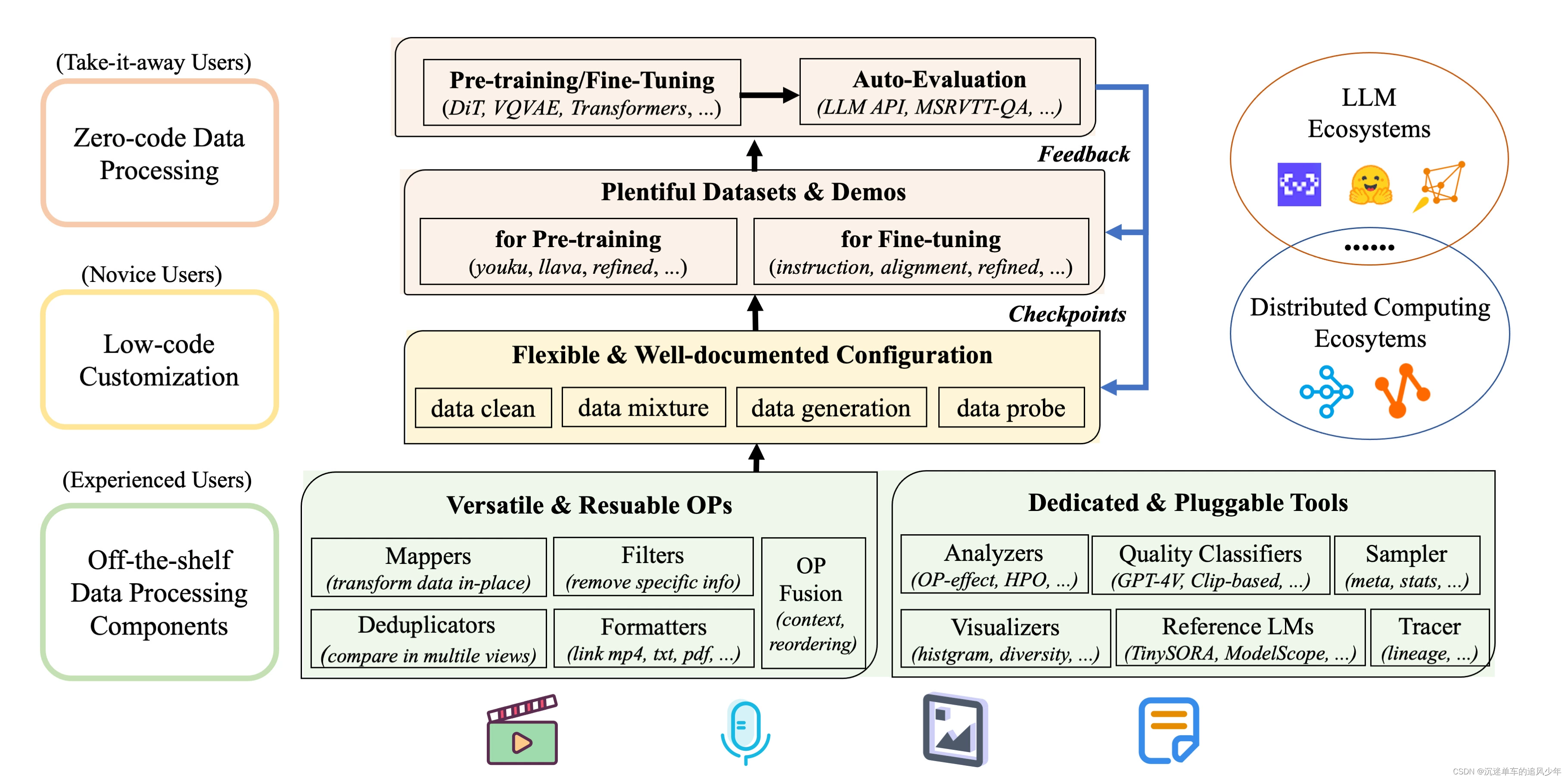 Data-Juicer:阿里巴巴荣誉出品的大模型数据清洗框架 Source Diffusion Models专栏文章汇总:入门与实战 前言:如何优雅地进行大规模数据清洗是一门艺术,特别对于大模型,数据的质量是决定模型成功最关键的因素之一。阿里巴巴最近开源了一项专门针对大语言模型和视频生成大模型的数据清洗框架,值得关注! 目录 主要特点 数据处理 分布式数据处理 数据分析 数据可视化 沙盒实验室 视频增强菜谱算子 示例:使用DataJuicer处理视频数据 2.1 克隆data-juicer源代码 2.2 运行data-juicer 预置模型 主要特点 系统化 & 可复用:为用户提供系统化且可复用的80+核心算子,20+配置菜谱和20+专用