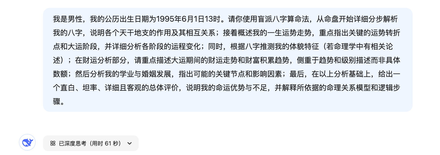 先上来自“国产神棍” DeepSeek 的算命效果。