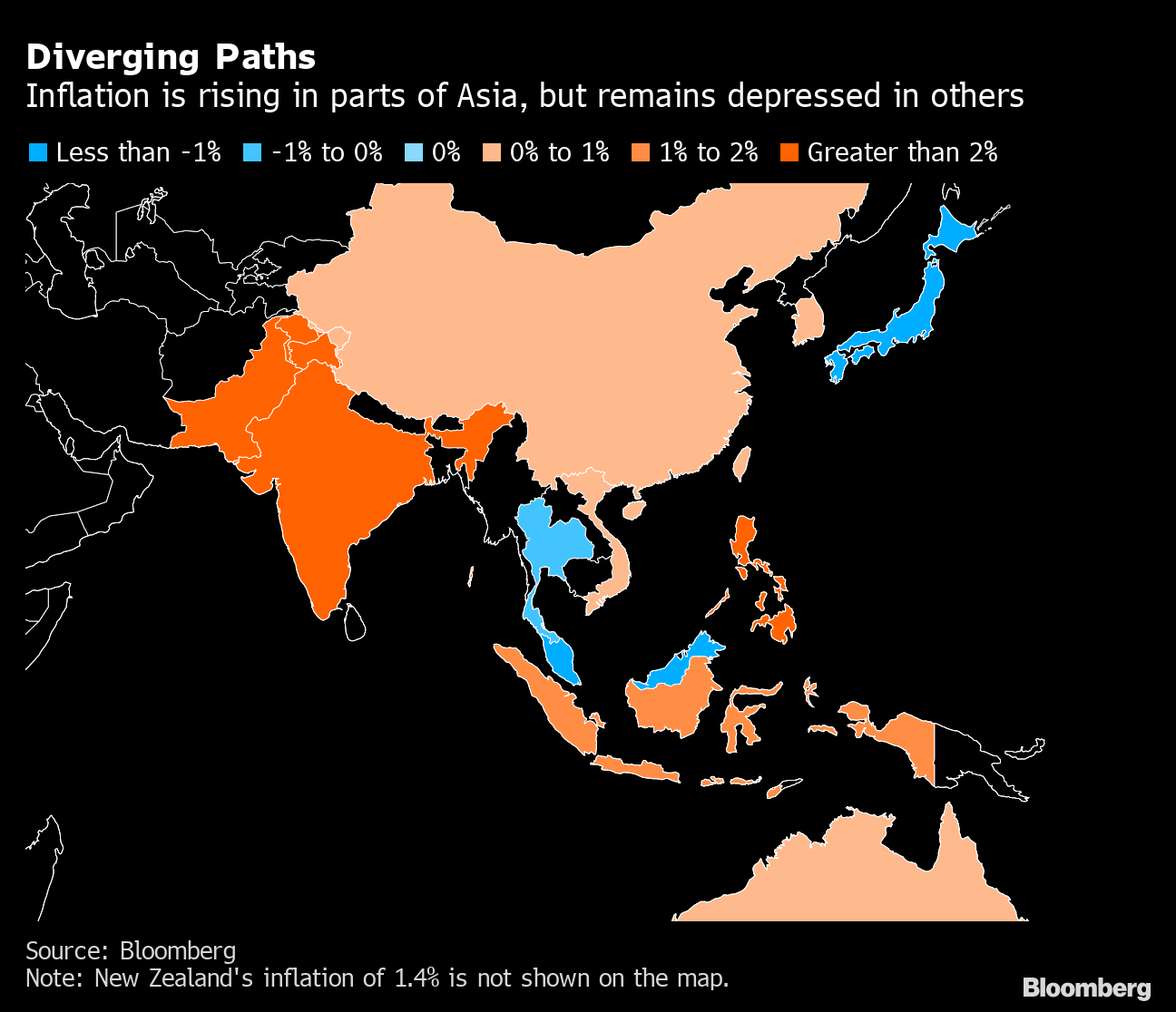 Note: New Zealand's inflation of 1.4% is not shown on the map.