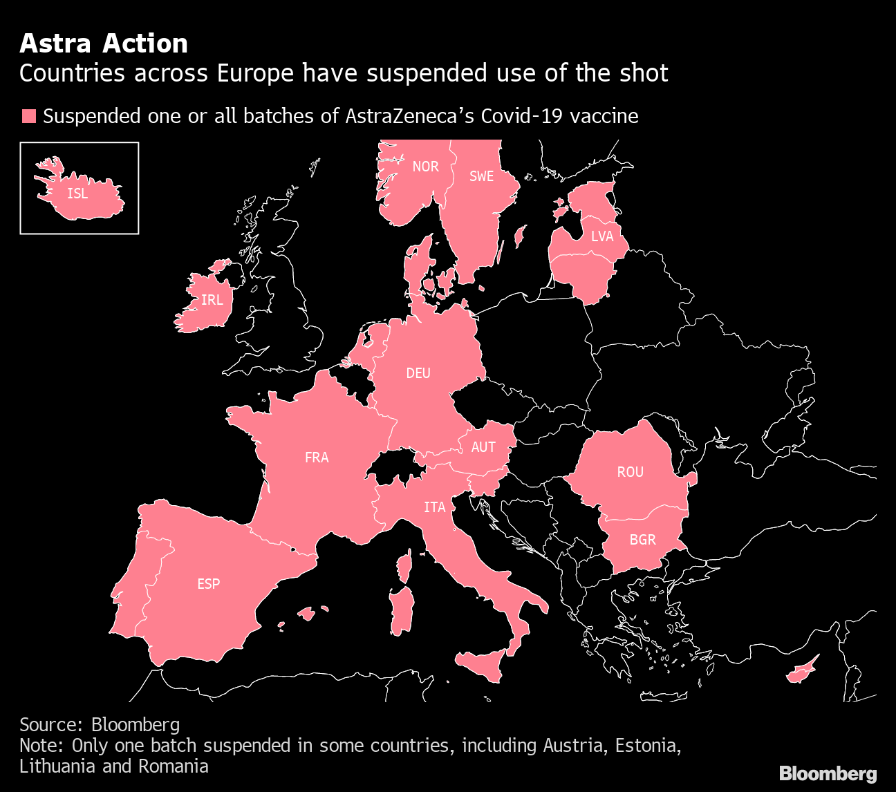 The suspensions in the EU contrast with Astra’s positive run in the U.K., where Prime Minister Boris Johnson is championing a rapid vaccination push and continues to deem the shot safe to use.
