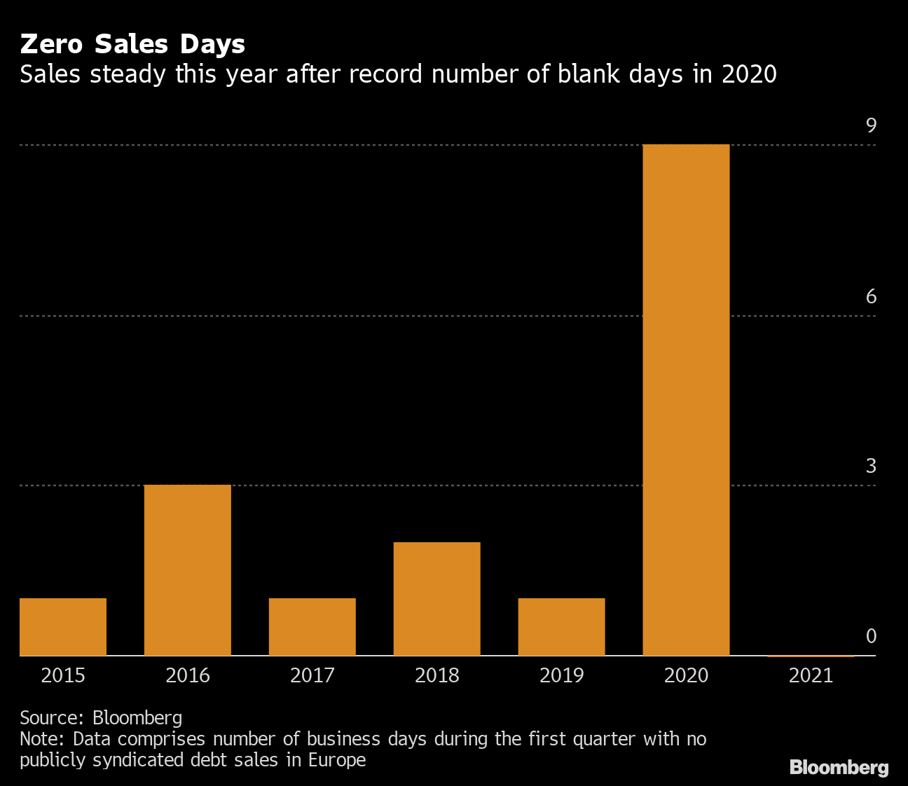 There hasn’t been a single blank day for bond sales in Europe this year, a stark contrast to the nine over the first quarter of 2020 as issuers sat out the volatility. New issuance subsequently exploded as companies dashed to build up cash reserves, leading to a record-smashing year for sales.