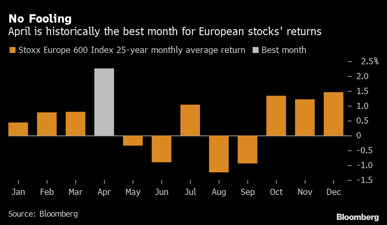 Historical trends are also supportive of further gains for Europe. The Stoxx 600 tends to post bigger returns in April than in any other month, looking at the average over the past 25 years.