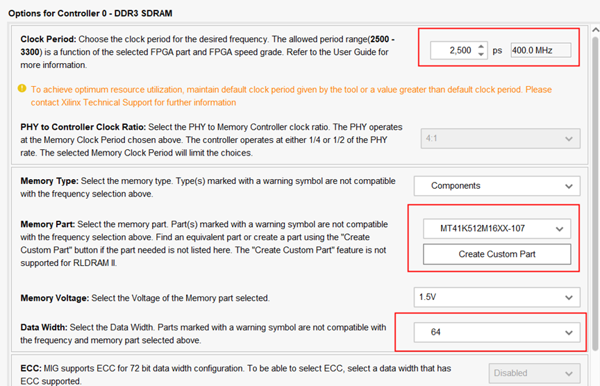 5 选择DDR3的工作频率,Memory的型号,此处需要注意的是,我们内部是没有MT41K512M16这个型号的,需要使用Create Custom Part进行创建,我这里使用的方法是,在MT41K256M16XX-107的基础上,将Row address修改为16即可,选择数据位宽为64bit。
