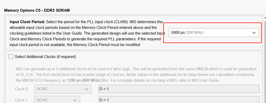 7 配置输入时钟频率,这个是输入MIG核的频率,IP核内部会自己调用PLL来产生自己的工作时钟,此处设置200MHz