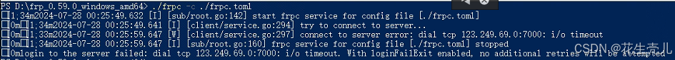 [0m[1;33m2024-07-28 00:25:59.647 [W] [client/service.go:297] connect to server error: dial tcp 0.0.0.0:7000: i/o timeout