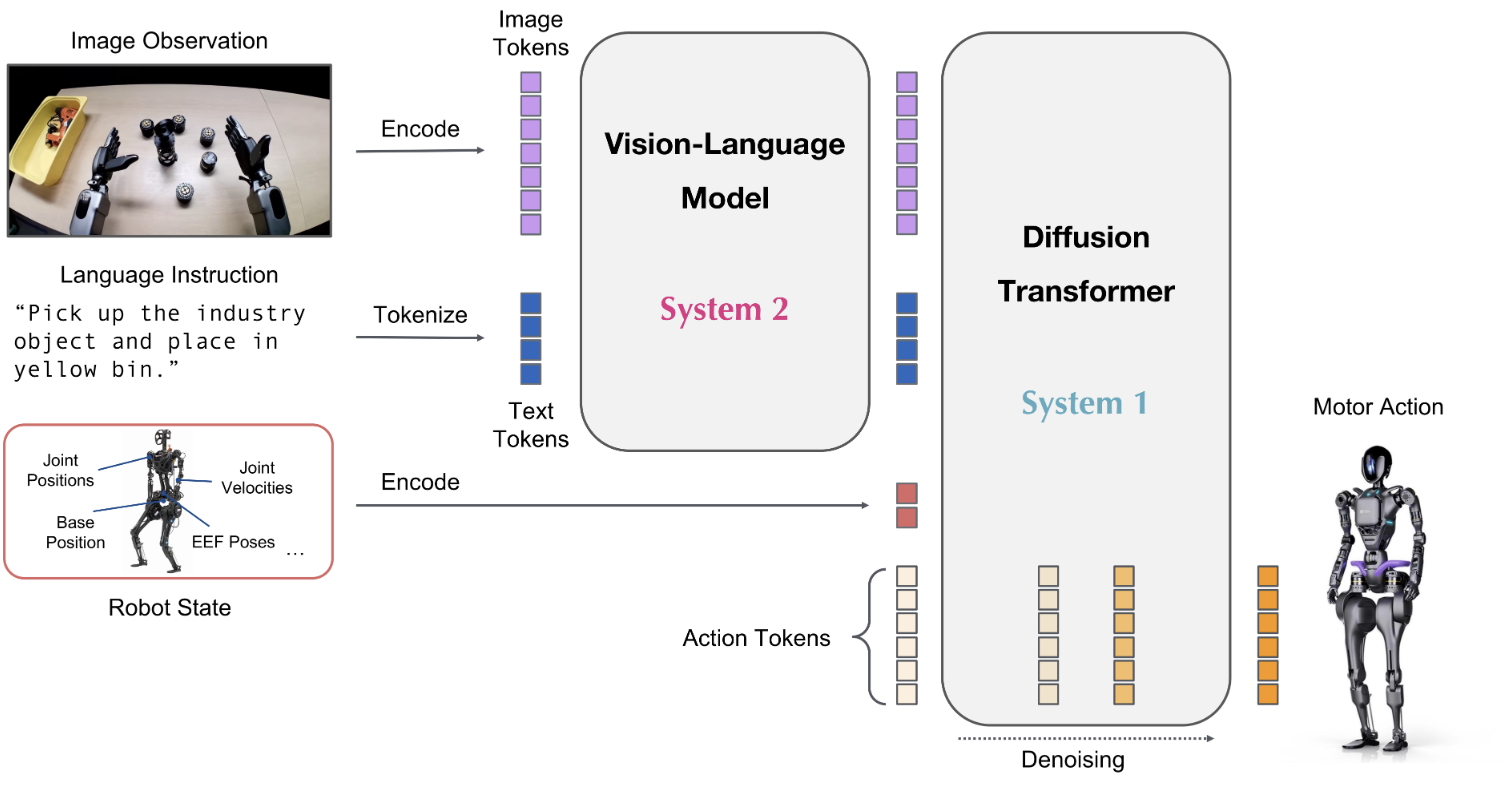 GR00T N1 是首款开源、可定制且预训练的人形机器人基础模型,拥有“System 1”(快速反应动作)与“System 2”(推理规划)的双系统架构。