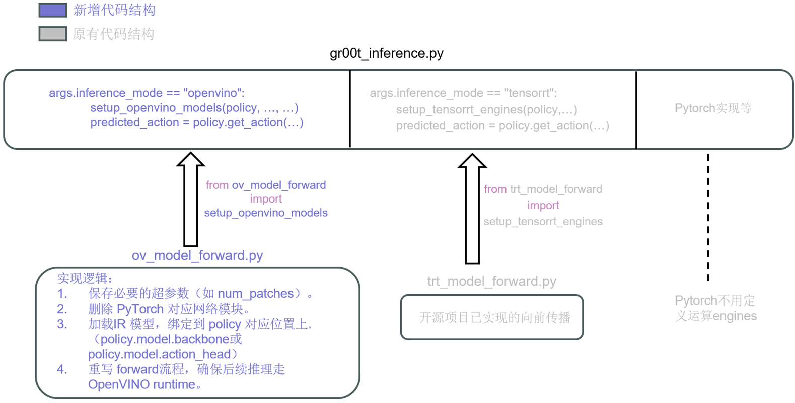 现在,我们已经有了一个“引擎” ov_model_forward.py,我们需要把他整合进gr00t_inference.py,因为这个就是源代码中的推理入口。所以我们需要在原来脚本中新增 --inference_mode=openvino 参数,支持切换运行模式。整个的逻辑比较好理解,上图已经展现。