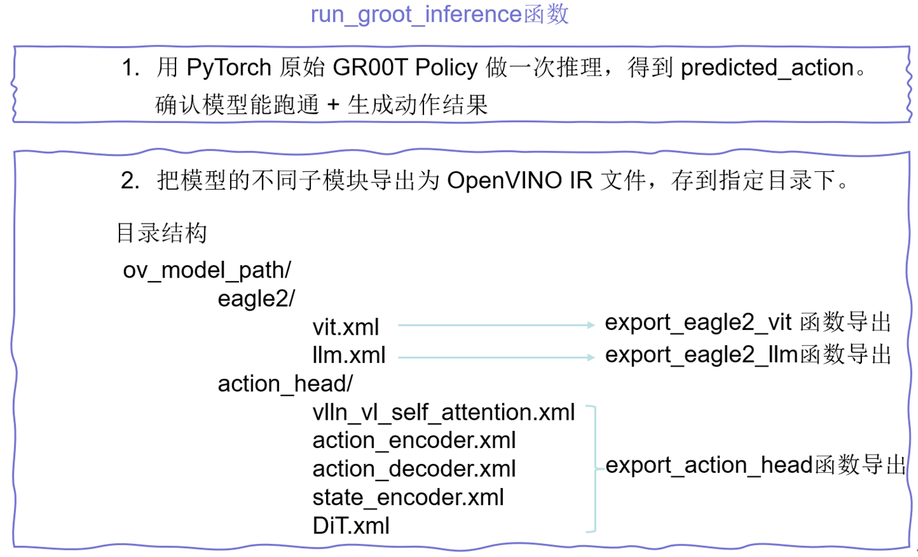可以看到,这套 Deployment Scripts 本质上围绕 “导出 → 编译 → 推理” 三个步骤展开。因此,接下来我将展示如何基于原有设计思想,针对 OpenVINO 重构出对应的导出(3.2小节)、forward(3.3小节)、推理(3.4小节)三大模块,让 GR00T 在 Intel 平台上顺畅运行。