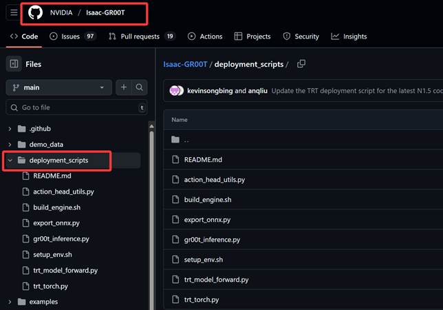 我们阅读代码就能发现,原先的Isaac-GR00T 仓库中,deployment_scripts/ 文件夹是整个推理部署流程的核心入口。这个目录下的脚本为 GR00T N1.5 提供了从模型导出、引擎构建,到推理执行的三个完整工具链(这其实也是我们扩展其intel生态的主要逻辑),源代码分为以下三个层次: