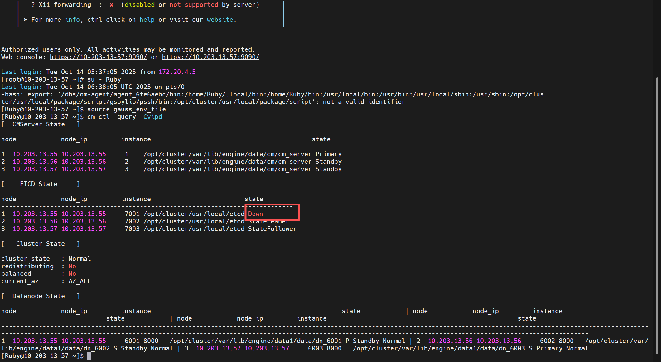 从外地出差回到公司总部,发现测试环境的GaussDB坏掉了,具体的故障现象就是etcd节点down状态。