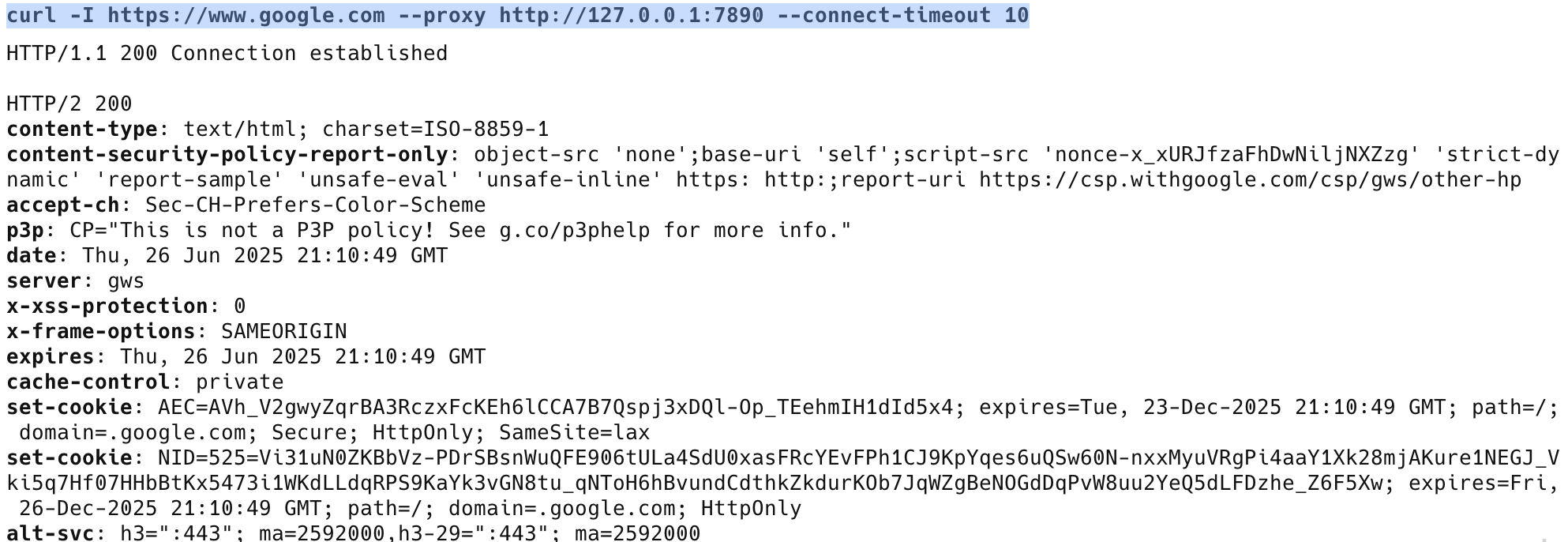 curl -I https://www.google.com --proxy http://127.0.0.1:7890 --connect-timeout 10