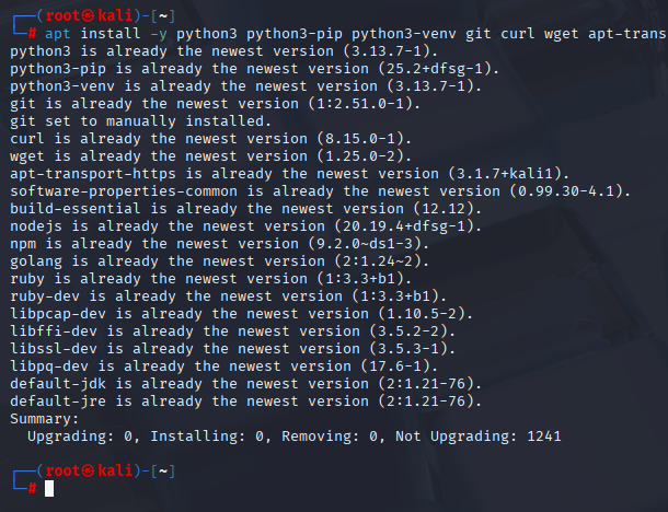 apt install -y python3 python3-pip python3-venv git curl wget apt-transport-https software-properties-common build-essential nodejs npm golang ruby ruby-dev libpcap-dev libffi-dev libssl-dev libpq-dev default-jdk default-jre