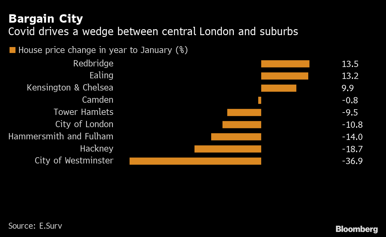 House prices in the City of London slumped 10.8% in the year through January, while Tower Hamlets, where rival financial district Canary Wharf is based, saw values drop 9.5%, according to a report by chartered surveyors e.surv. While the rest of the U.K. has enjoyed a housing boom during the pandemic, central London has seen the reverse as sliding rents weigh on prices.
