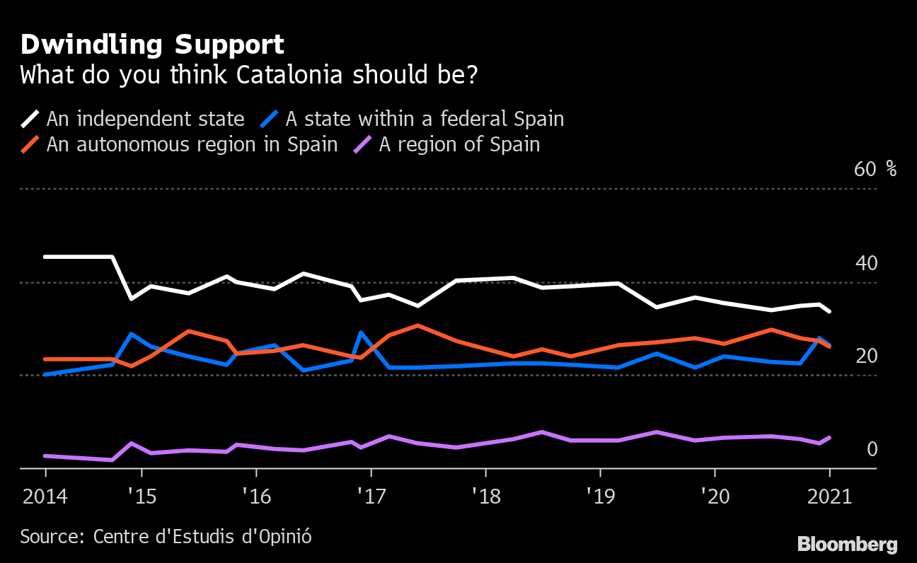When given multiple options, 34% of respondents to a January survey by the Catalan government’s pollster said the region should be an independent state, the lowest since at least 2014. On a binary “yes" or “no" question, 44.5% said they wanted Catalonia to become independent.