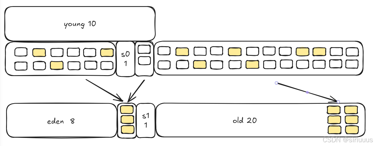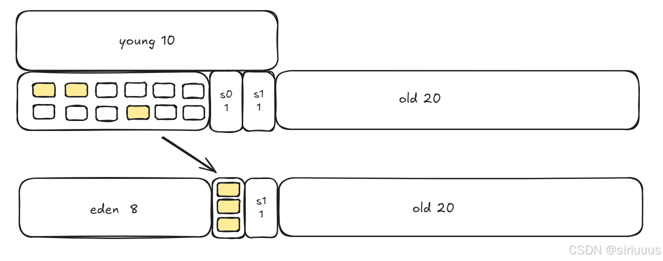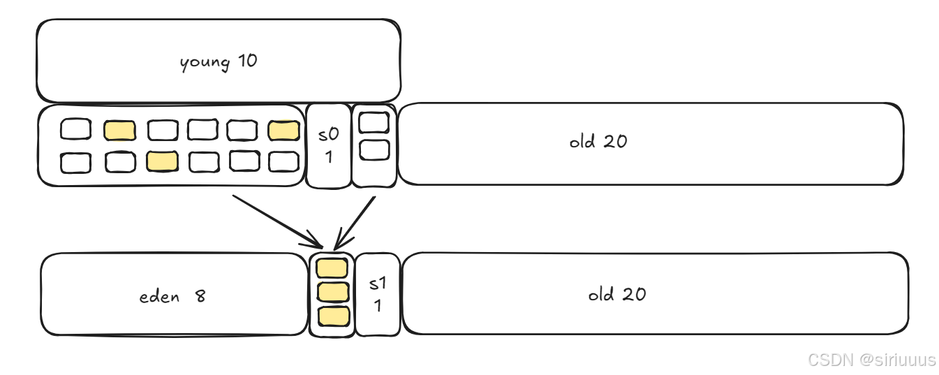 先标记 eden 存活对象,然后将存活对象复制到 s0(假设本次是 s0,也可以是 s1,它们可以调换),eden 剩余所有空间都清空。第一次 GC 完成。