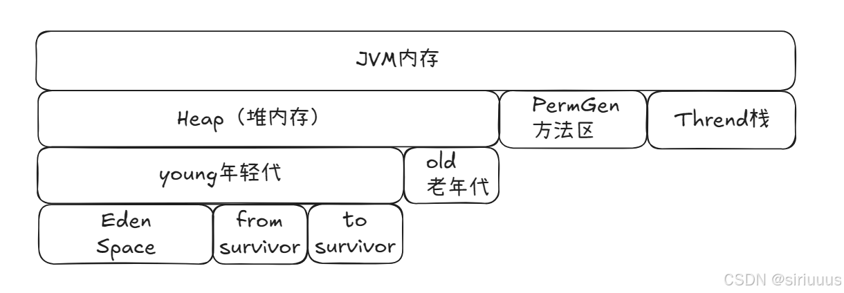 JVM 内存区域:Java 堆通常被划分为几个不同的区域,如年轻代(Young Generation)、年老代(Old Generation)和永久代(PermGen,在 Java 8 及以后的版本中被称为元空间 Metaspace)。