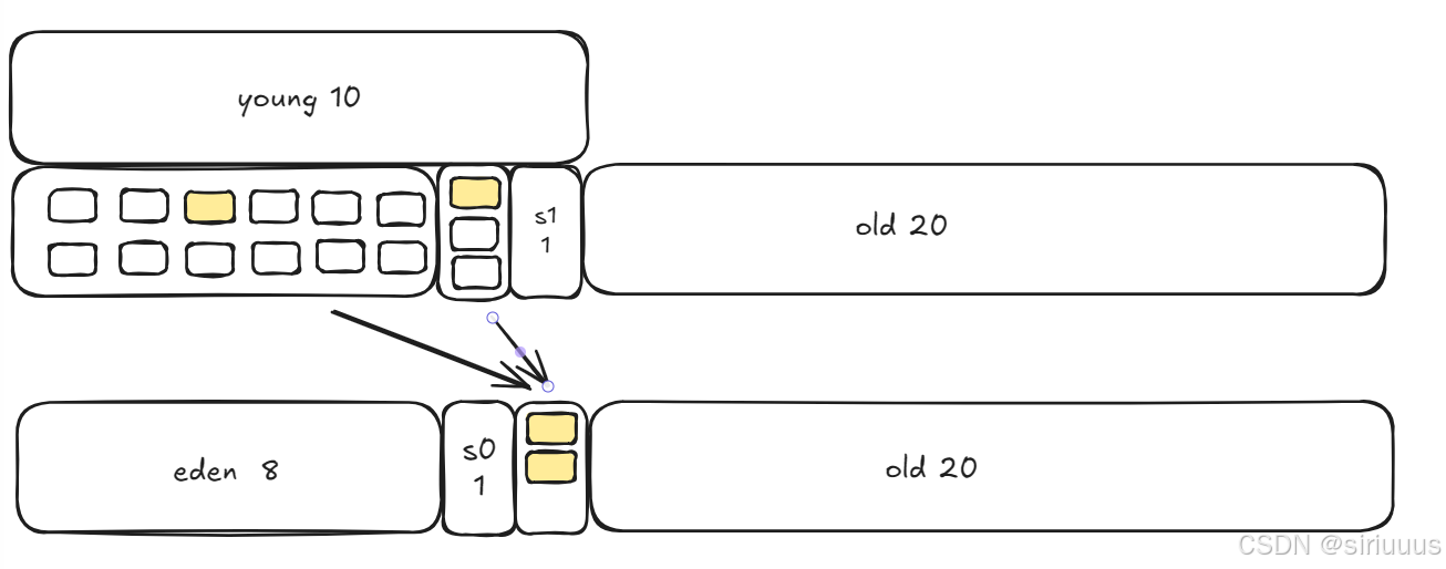 先同时标记 eden 和 s0 中存活对象,然后将存活对象复制到 s1。将 eden 和 s0 清空,第二次 GC 完成。