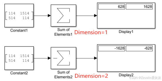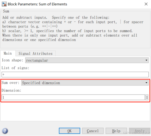 (3)相比于加法模块和减法模块,累加模块可以设置运算的维度,默认情况下“Sum over”为All dimensions,即所有维度进行求和,简单说就是所有元素全部求和,如果将其更改为Specified dimension,那么可以指定元素在某个维度分别进行相加(对二维输入而言,可以按列求和或者按行求和,维度分别为1和2)。