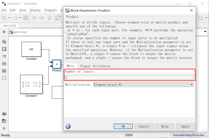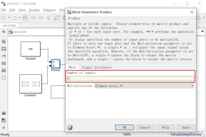 (3)将乘除法模块添加到模型文件中,双击它,可以打开其属性配置框,属性“Number of inputs”表示输入端口的数量,当该属性值为数字时默认所有端口的输入量作为乘数,如果希望一些输入量作为除数,属性“Number of inputs”的设置可以仿照加减法模块,比如该乘除法模块有两个输入端口,那么就有两个符号,其中每个符号各自代表其对应输入端口的量是作为乘数还是除数,“*”对应乘法,“/”对应除法。