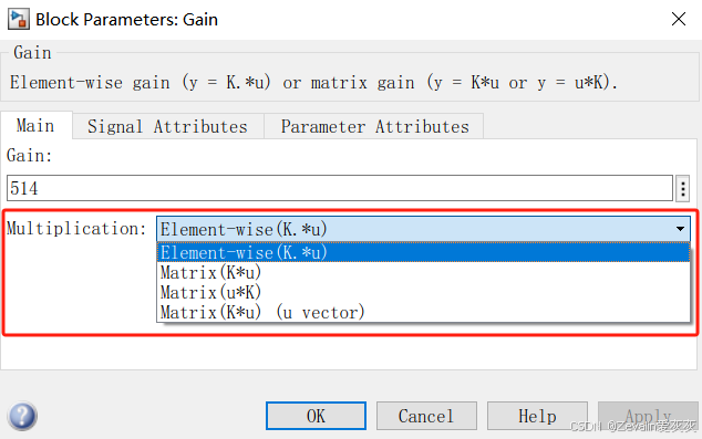 (2)通过配置乘法参数,可以指定增益模块的乘法规则(主要针对乘法运算中有操作数为向量或矩阵时,可以选择点乘、增益左乘输入、增益右乘输入等)。