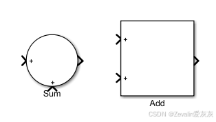 Sum模块实现的功能和Add模块完全相同,甚至基本配置也是一模一样,除了默认形状为圆形、输入端口排列为“三缺一”以外,这里不再赘述。