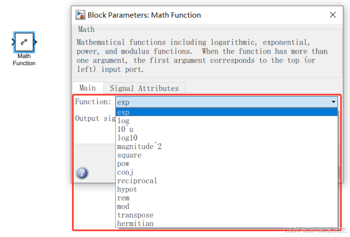 (2)数学函数模块提供若干种函数选择,有exp(以e为底的指数函数)、log(以e为底的对数函数)、10^u(以10为底的指数函数)、log10(以10为底的对数函数)、magnitude^2(求输入的模平方)、square(求输入的平方)、pow(输入u为底数,输入v为指数)、conj(求共轭)、reciprocal(求输入的倒数)、hypot(求两个输入的平方之和的平方根)、rem(求两个输入做除法的余数,余数的符号与被除数相同)、mod(求两个输入做除法的余数,余数的符号与除数相同)、transpose(对输入的矩阵做转置)、hermitian(求输入矩阵的埃尔米特矩阵)。