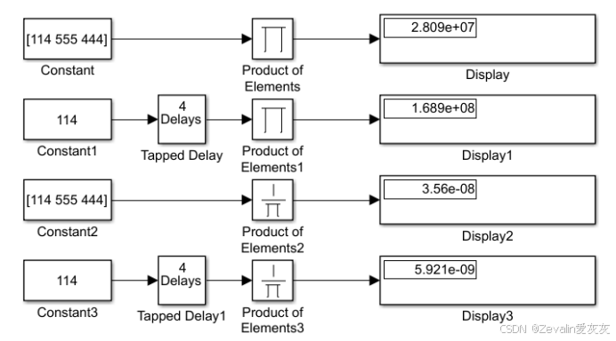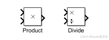 (1)当Product模块或者Divide模块的输入只有一个乘数端口时,它们都会转变为连乘模块;当Product模块或者Divide模块的输入只有一个除数端口时,它们都会转变为连除模块(不过模块库中并没有连除模块,为了方便称呼,这里把它也算作连乘模块)。
