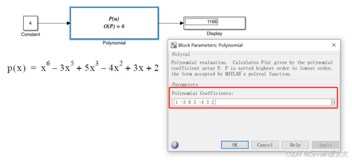 (1)使用多项式模块时需要为其配置多项式系数,多项式系数按照降幂排列(即次数较高项的系数在前),组成一个矩阵。