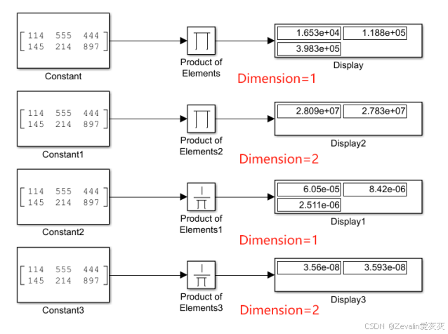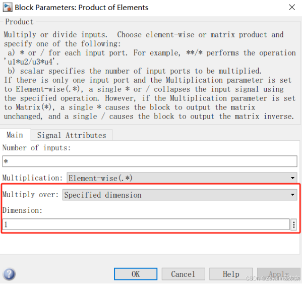 (3)相比于乘法模块和除法模块,连模块可以设置运算的维度,默认情况下“Multiply over”为All dimensions,即所有维度进行连乘/连除,简单说就是所有元素全部连乘/连除,如果将其更改为Specified dimension,那么可以指定元素在某个维度分别进行连乘/连除(对二维输入而言,可以按列连乘/连除或者按行连乘/连除,维度分别为1和2)。