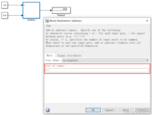 (3)以Subtract模块为例,双击Subtract模块,属性“List of signs”表示输入端口的符号排列,比如下图的Subtract模块有两个输入端口,那么就有两个符号,其中每个符号各自代表其对应输入端口的量是作为加数还是减数,“+”对应加法,“-”对应减法,至于“|”符号,它起到一个占位的作用(可认为把它也当成一个输入端口,不过这个输入端口是被堵死的)。