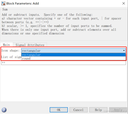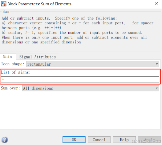 (4)如果将模块的“List of signs”配置成一个加号或者一个减号,那么模块将会实现求和功能或者求和的相反数功能,这时模块的输入虽然只有一个端口,但往往不止一个操作数,这个输入端口可能连接一个矩阵输入,亦或者是一根有多个信号传输的信号线。
