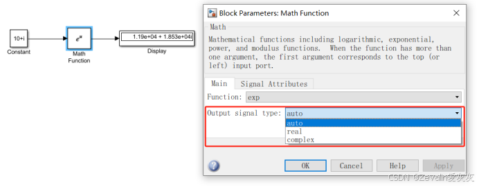 (3)模块输出信号的数据类型可选择自动(auto)、实数(real)和复数(complex)。