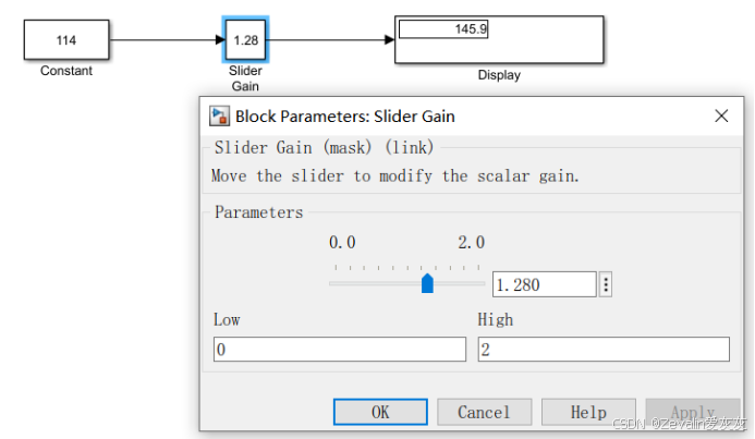 相比于普通的增益模块,滑动增益模块可通过拖动滑块修改增益系数,为此需要设置滑动增益模块增益系数的上限(High)和下限(Low)。