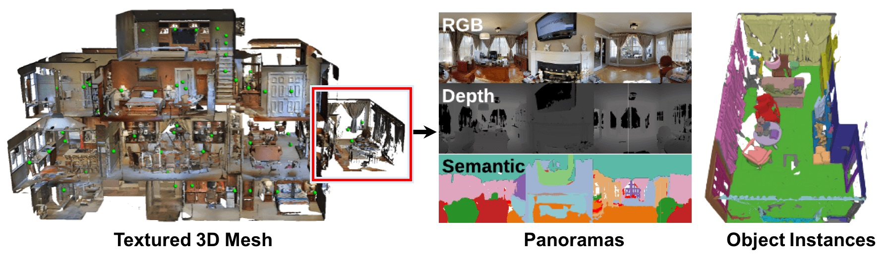 包含 90 个建筑规模场景的 194,400 张RGB-D图像,以及10,800个全景视图。